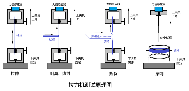 在夾具的兩個(gè)夾頭之間固定好處理過的試樣,啟動(dòng)儀器使兩夾頭做相對(duì)運(yùn)動(dòng),位于動(dòng)夾頭上的力值傳感器采集試驗(yàn)過程中的力值變化,機(jī)器內(nèi)置的位移傳感器采集位移變化,從而計(jì)算出試樣的拉伸、撕裂、變形率等性能指標(biāo)。
