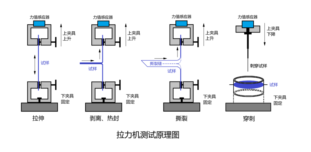 在夾具的兩個(gè)夾頭之間固定好處理過的試樣,啟動(dòng)儀器使兩夾頭做相對運(yùn)動(dòng),位于動(dòng)夾頭上的力值傳感器采集試驗(yàn)過程中的力值變化,機(jī)器內(nèi)置的位移傳感器采集位移變化,從而計(jì)算出試樣的拉伸、剝離、熱封、撕裂等性能指標(biāo)。