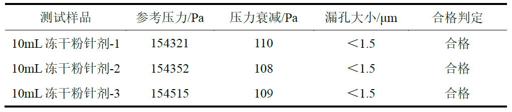 由于凍干粉針劑的加工工藝,某些成品頂空接近極限真空,內(nèi)容物為餅狀固體。如果包裝系統(tǒng)發(fā)生泄漏,瓶內(nèi)真空度會發(fā)生改變,選用真空衰減測試此類產(chǎn)品,可能會因沒有建立有效壓差,出現(xiàn)假陰性的測試結(jié)果。本次測試采用壓力衰減法,設(shè)置有效的測試參數(shù),通過模擬泄漏建立線性關(guān)系,測試陰性實(shí)體和激光打孔陽性樣品進(jìn)行準(zhǔn)確度驗(yàn)證。結(jié)果表明,該法靈敏度高,數(shù)據(jù)準(zhǔn)確,可有效檢測凍干粉針劑的密封性。
