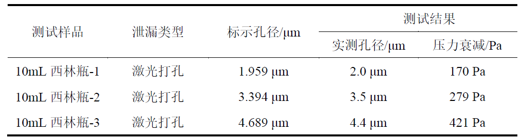 陽性樣品的制備采用激光打孔制備技術(shù),其漏孔幾何形狀和內(nèi)部氣體流動(dòng)行為最接近真實(shí)缺陷,打孔位置在瓶身。把陽性樣品放入測試腔進(jìn)行測試,通過陽性樣品的標(biāo)示孔徑與儀器測試推算出來的孔徑做對比,來驗(yàn)證儀器的準(zhǔn)確度。陽性樣品見圖4,測試結(jié)果見表1。