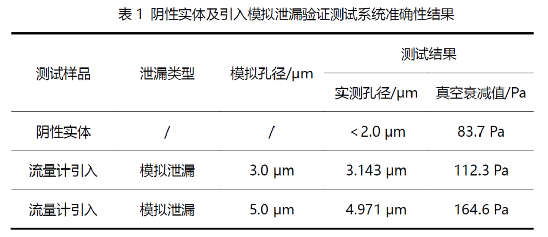 用陰性實(shí)體和氣體流量計(jì)引入已知的泄漏流量,驗(yàn)證測(cè)試系統(tǒng)的實(shí)測(cè)值與流量計(jì)的模擬值是否接近以判斷包裝系統(tǒng)測(cè)試結(jié)果的準(zhǔn)確性,采用與被測(cè)樣品外形、體積尺寸相同的實(shí)心體作為陰性對(duì)照樣品,放置在根據(jù)樣品尺寸定制的亞克力夾具中進(jìn)行測(cè)試,真空衰減值測(cè)試結(jié)果為83.7 Pa,結(jié)果判定為無泄漏,以氣體流量計(jì)模擬3.0 μm和5.0 μm漏孔對(duì)應(yīng)的泄漏流量進(jìn)行測(cè)試,測(cè)試結(jié)果如表1所示。