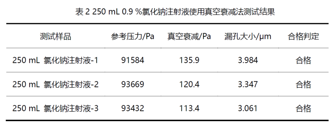 本次測(cè)試樣品為250 mL輸液袋,內(nèi)容物為 0.9 % 氯化鈉注射液,包裝內(nèi)存在常壓潔凈空氣,抽真空可有效建立測(cè)試腔與樣品包裝系統(tǒng)的內(nèi)外壓差,因此選用真空衰減法對(duì)樣品進(jìn)行檢測(cè)。設(shè)置有效的測(cè)試參數(shù)、通過模擬泄漏建立線性關(guān)系,測(cè)試陰性實(shí)體和模擬泄漏進(jìn)行準(zhǔn)確度驗(yàn)證。結(jié)果表明,該方法可有效檢測(cè)250 mL輸液袋柔性包裝的密封性。