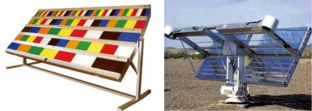 上圖為室外曝露架示例,其中右圖裝置通過鏡子聚集陽光照射,加速產(chǎn)品老化,節(jié)省試驗(yàn)時(shí)間。