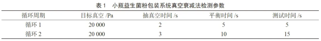 基于小瓶裝即食益生菌粉樣品特征,AUTO GBM-L2 雙壓法微泄漏密封測試儀參數(shù)設(shè)定見表1。