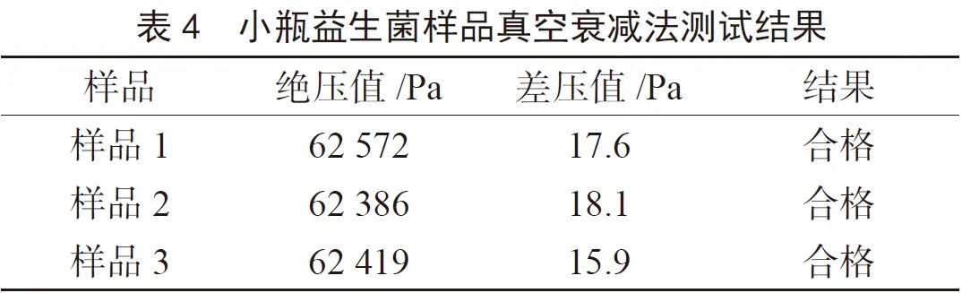 分別取同批次3個小瓶益生菌樣品放進(jìn)測試腔內(nèi),蓋好上腔蓋,按上述方法測試,測試結(jié)果見表4。本次測試的小瓶裝即食益生菌粉樣品絕壓值均小于大泄漏閾值67 173 Pa,測試進(jìn)入循環(huán)2階段,差壓值均小于小泄漏閾值28.8 Pa,系統(tǒng)判定合格。樣品測試結(jié)果未達(dá)到方法檢出限(3 μm),包裝系統(tǒng)密封性良好。