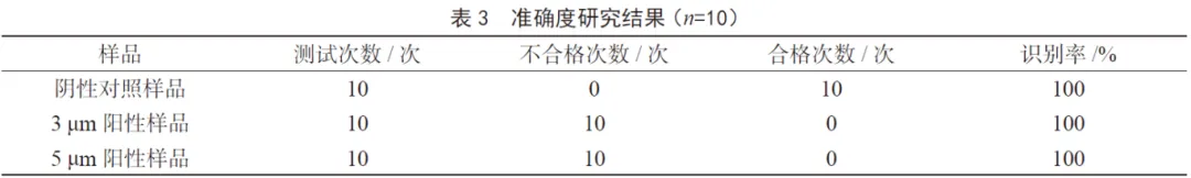 分別取陰性對照樣品、3 μm陽性樣品(流量計(jì)引用泄漏)、5 μm陽性樣品(流量計(jì)引入泄漏),依次進(jìn)行10 次重復(fù)測試,陰性樣品檢測結(jié)果合格,陽性樣品檢測結(jié)果為不合格,識別率達(dá)100%,可見方法準(zhǔn)確度良好。測試結(jié)果見表3。