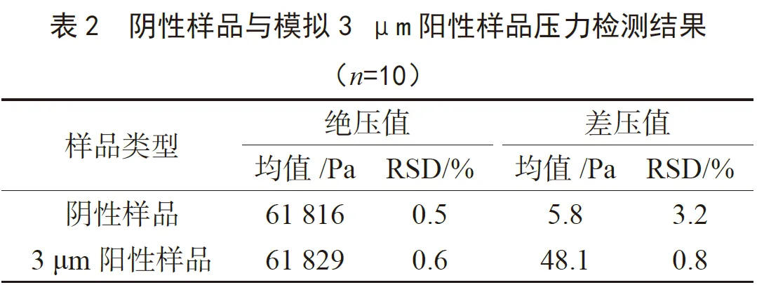 取陰性對照樣品,放進(jìn)測試腔,重復(fù)測試10 次,記錄測試的絕壓值和差壓值。使用氣體流量計(jì)連接腔體,調(diào)節(jié)流量0.077 mL·min-1,模擬3 μm的泄漏通道,重復(fù)10 次,記錄測試的絕壓值和差壓值。陰性樣品、3 μm陽性樣品(引入泄漏)的壓力數(shù)值見表2。