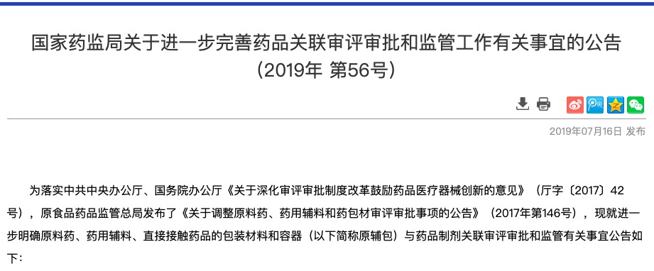 為落實中共中央辦公廳、國務(wù)院辦公廳《關(guān)于深化審評審批制度改革鼓勵藥品醫(yī)療器械創(chuàng)新的意見》(廳字〔2017〕42號),原食品藥品監(jiān)管總局發(fā)布了《關(guān)于調(diào)整原料藥、藥用輔料和藥包材審評審批事項的公告》(20