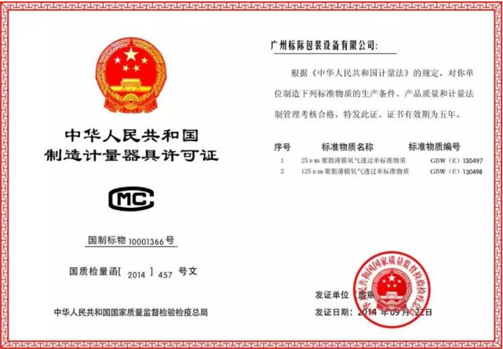 氧氣透過(guò)率國(guó)家標(biāo)準(zhǔn)物質(zhì)制造計(jì)量器具許可證——廣州標(biāo)際(GBPI)