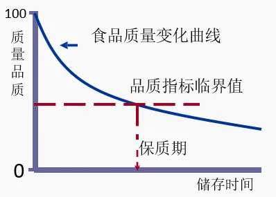 通過檢測和感觀分析得到?jīng)Q定食品保質(zhì)期的主要品質(zhì)(或品質(zhì)劣變)指標(biāo),如假設(shè)包裝前食品中油脂氧化后的哈喇味物質(zhì)含量為0,一段時間后出現(xiàn)輕微的哈喇味或檢測到過氧化值達到限量為食品品質(zhì)的臨界值(如下圖中紅色虛線對應(yīng)的質(zhì)量品質(zhì)),則該食品在一定溫度條件下的保質(zhì)期就是食品質(zhì)量變化曲線與臨界值的交點所對應(yīng)的儲藏時間,如下圖所示: