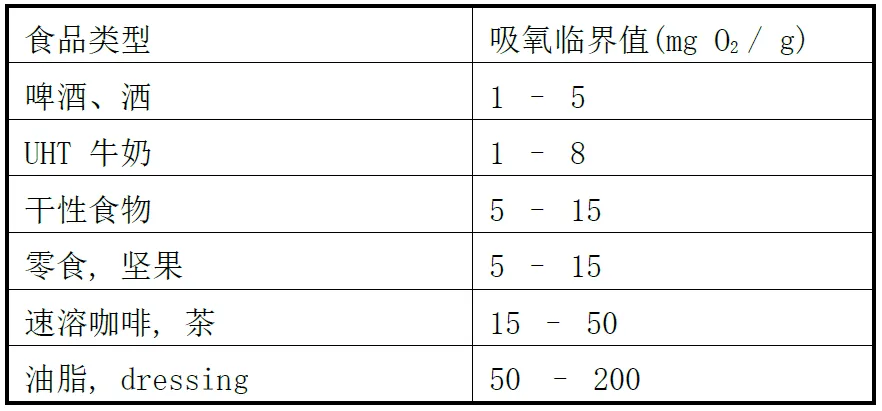 在條件有限情況下,有時候食品相關(guān)品質(zhì)指標(biāo)的極限值難以得到,也不能與包裝阻隔性等指標(biāo)聯(lián)系。此時,通過相關(guān)測試、標(biāo)準(zhǔn)與感觀評定綜合得出常見食品吸收氧氣或水汽的極限指標(biāo),可將食品品質(zhì)變化與包裝聯(lián)系在一起,可方便地對食品保質(zhì)期進行預(yù)測。下表為幾種常見食品的吸氧臨界值值,可在預(yù)估保質(zhì)期時結(jié)合具體食品品質(zhì)與感觀評定選用: