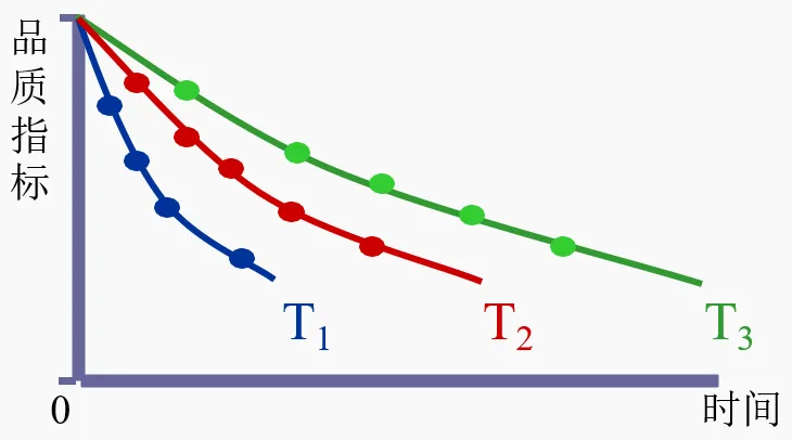 確定影響食品保質(zhì)期的主要品質(zhì)指標(biāo)后,接下來就要通過實驗或已有文獻數(shù)據(jù)確定該指標(biāo)隨時間的變化規(guī)律。一般食品品質(zhì)指標(biāo)隨時間的變化與溫度密切相關(guān),變化規(guī)律如下圖所示: