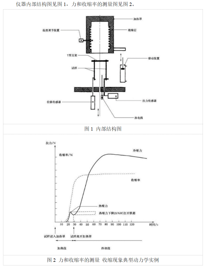 本試驗儀利用空氣加熱原理,將被測試樣連接到拉力傳感器和位移傳感器上,達到最大收縮力后,再將其置于環(huán)境溫度為23℃±2℃的外部試驗環(huán)境下冷卻,儀器連續(xù)記錄參考溫度、收縮力以及位移,所記錄的數(shù)據(jù)可以用來確定薄膜的最佳收縮條件。
