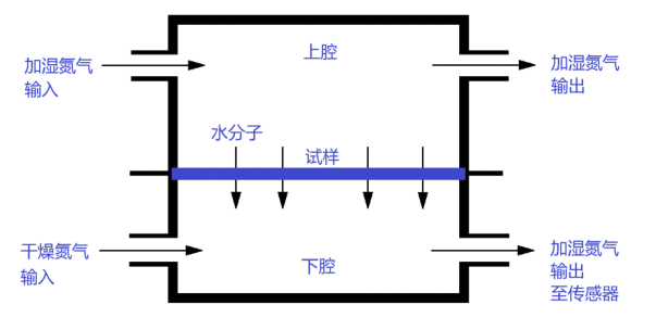 W203 2.0水蒸氣透過率測定儀采用電解法原理。將預(yù)先處理好的試樣固定在測試腔中間,把測試腔分為高濕側(cè)及低濕側(cè),加濕氮?dú)庠诒∧さ囊粋?cè)流動,干燥氮?dú)猓ㄝd氣)在另一側(cè)以固定留速流動,由于濕度梯度的存在,水蒸氣會從高濕側(cè)滲透到低濕側(cè),透過試樣的水蒸氣被流動的干燥氮?dú)鈹y帶至電解傳感器,通過對傳感器輸出的電信號得出試樣的水蒸氣透過率等參數(shù)。