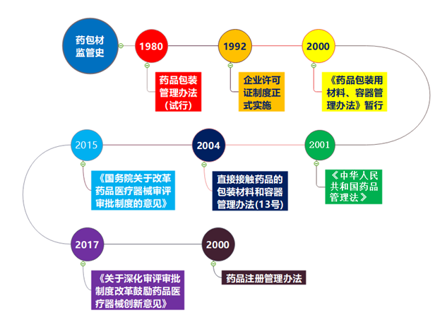 藥品品質(zhì)是事關(guān)人類健康的頭等大事,嚴(yán)格的評審與注冊制度是保障藥品品質(zhì)的關(guān)鍵。1 藥包材監(jiān)管發(fā)展歷程從藥包包材監(jiān)管發(fā)展歷程可以看到,國家對藥包材品控是十分重視的,監(jiān)管制度不斷發(fā)展與成熟,也越來越趨于合理