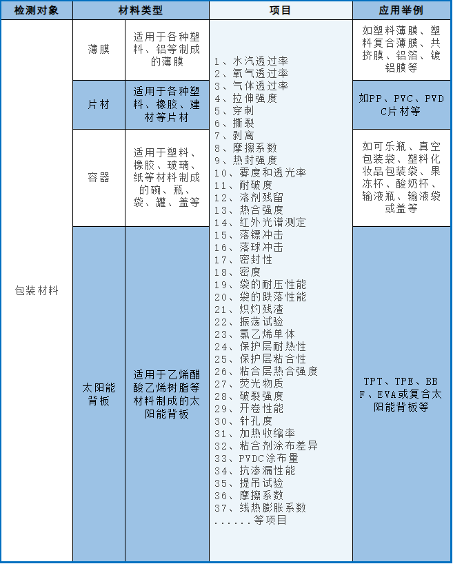 業(yè)務(wù)涵蓋阻隔性、拉伸、穿刺、剝離、熱封強(qiáng)度、摩擦系數(shù)、霧度和透光率、耐破度、溶劑殘留、熱合強(qiáng)度、紅外光譜測(cè)定、沖擊、密封性、密度、袋的跌落/耐壓性能、熾灼殘?jiān)榷囝悪z測(cè)項(xiàng)目。