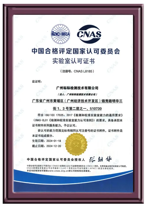 檢測(cè)實(shí)驗(yàn)室通過(guò)了中國(guó)合格評(píng)定國(guó)家認(rèn)可委員會(huì)(CNAS)認(rèn)可的實(shí)驗(yàn)室(注冊(cè)編號(hào):L8185),我們獲得了檢驗(yàn)檢測(cè)機(jī)構(gòu)資質(zhì)認(rèn)定(CMA),證書(shū)編號(hào):201819003511,這標(biāo)志著我們的檢測(cè)服務(wù)符合國(guó)家和國(guó)際標(biāo)準(zhǔn),檢驗(yàn)報(bào)告可用于產(chǎn)品質(zhì)量評(píng)價(jià)、成果及司法鑒定,具有法律效力。